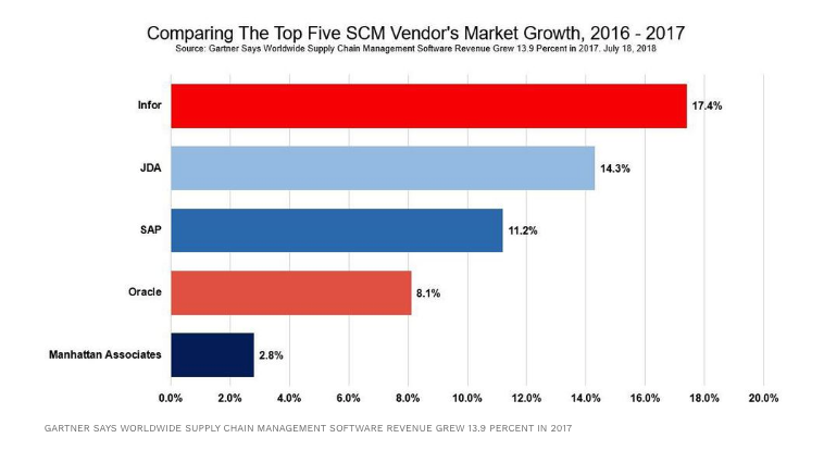 When it comes to the top five supply chain management vendors, Infor saw the largest growth from 2016 to 2017. As the article states, “Infor outperformed the market’s growth according to Gartner’s Balaji Abbabatulla, Research Director. Infor historically dominates the supply chain execution sector of the SCM market and is seeing strong demand for their procurement solutions. Infor generated $2.9B in total revenues in FY 2017, and it’s estimated their total SCM business generates between $275M to $300M annually.”