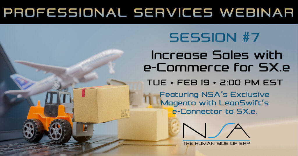 Join us for our next Professional Services Webinar on February 19, 2019 at 2:00 pm EST! Session #7 “Increase Sales with eCommerce for SX.e” will feature NSA’s exclusive Magento with LeanSwift’s eConnector to SX.e.